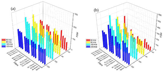 (a) FOM of lung field result using various filters (Al, Cu, Mo, W, and no filter), (b) FOM of heart field result using various filters (Al, Cu, Mo, W, and no filter) at 60, 80, 100, and 120 kVp.