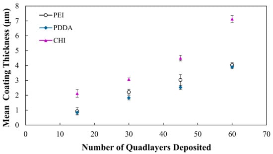 As shown in Figure 1, the thickness of the coatings increases with the number of QLs deposited, and this is observed for all coating types on the glass microscopic slides. Throughout the deposition process, it can be observed that the growth of the PEI and PDDA coatings is quite similar, with both coating types reaching an approximate thickness of 4 μm at 60 QLs. The CHI coating maintains a thicker coating, and at 60 QLs it reaches a thickness of 7 μm.