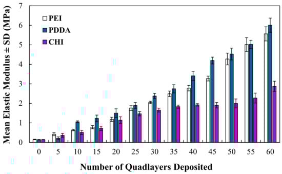 The mechanical properties, derived from compressive testing, determine that the elastic modulus of the coated foams increases as a function of the number of QLs deposited, as shown in Figure 4. The modulus of the open-cell foams increased from 0.15 ± 0.10 MPa when uncoated to 5.51 ± 0.40 MPa, 6.01 ± 0.36 MPa and 2.61 ± 0.41 MPa for the PEI, PDDA and CHI coatings deposited with 60 QLs, respectively. The PEI and PDDA coatings exhibit comparable increases in the modulus throughout testing, although the CHI-coated foams exhibit a notably lower modulus, although, overall, this increases with the number of QLs deposited.