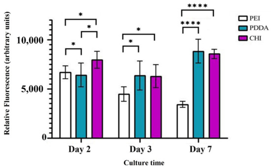 There is a decreasing trend in the cell viability of the PEI coating as the culture time increases; however, this was not shown for the PDDA and CHI coatings, as seen in Figure 5. Reviewing the results of day 7, as the longest day of culture, it is apparent that the PEI coating has a considerably lower cell viability, with statistically significant differences (p < 0.0001) observed between PEI and PDDA, and the PEI and CHI coatings. There was no statistically significant difference between the PDDA and CHI coatings at day 7.