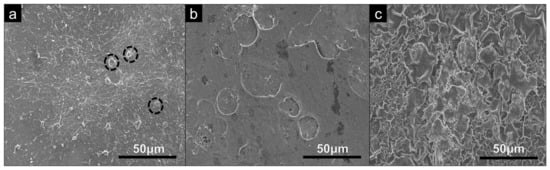 SEM analysis of 60 QL (a) PEI, (b) PDDA and (c) CHI coatings on glass microscopic slides examined at a magnification of ×1k.