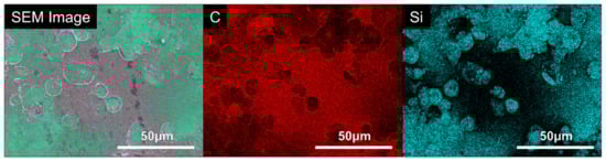 EDX was utilised for further analysis because the film formed on the surface of the PDDA coating was cellular. The elemental composition of the cellular film was examined, as shown in Figure 7, with the presence of silicon linked to the coating, due to its presence in the nanoclay layers, and carbon indicating a cellular material. EDX analysis confirmed that silicon was much less abundant in the areas of the cellular film on the surface of the substrate. Moreover, the high intensity of the carbon present on the film further corroborates that it is a cellular material.