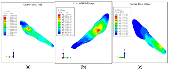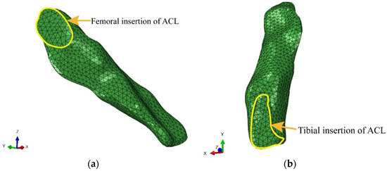 - Homyk, A.; Orsi, A.; Wibby, S.; Yang, N.; Nayeb-Hashemi, H.; Canavan, P.K. Failure locus of the anterior cruciate ligament: 3D finite element analysis. Comput. Methods Biomech. Biomed. Eng. 2012, 15, 865–874. [Google Scholar] [CrossRef]