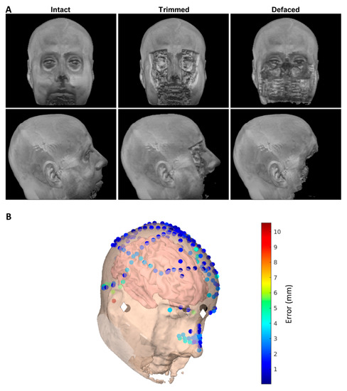 As can be seen in Figure 4, the shape of the inner skull surfaces does differ between conditions. Moreover, as shown in the left panel of Figure 4B, the difference between the surfaces extracted from the Intact and De-faced images (median = 0.49 mm) is significantly larger (p < 0.001) than the difference between those extracted from the Intact and Trimmed images (median = 0.20 mm).