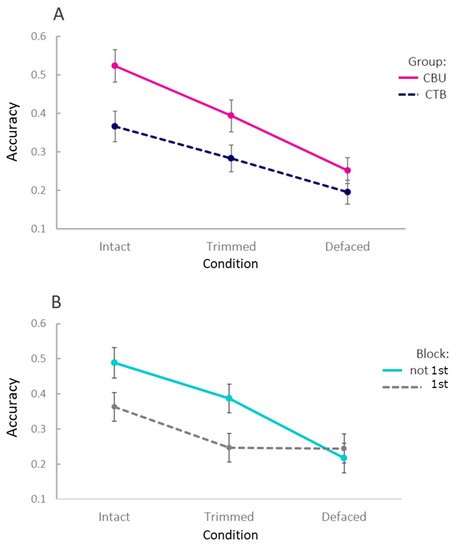 However, the above analysis disguises an effect of block order on accuracy. When dividing the data according to an (between-participant) “order” factor, defined by whether or not a condition was the first one attempted, performance improved after first exposure to a condition, at least for the Intact and Trimmed faces (Figure 2B; performance on the De-faced condition remained close to chance). This suggests that the most appropriate test of identification is to examine first blocks only, so that the accuracy of, for example, Trimmed faces is not contaminated by having previously seen the Intact versions.