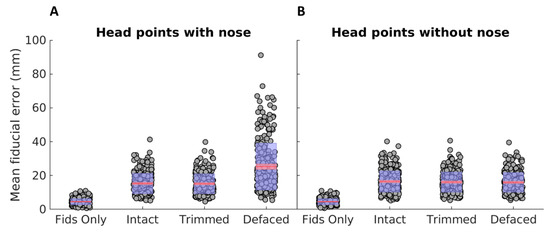 Most important of all, however, is to compare coregistration when the nose points are included and the nose is present (in the Trimmed MRI) with that when the nose points are excluded and the nose is absent (from the De-faced MRI)—i.e., the third and eighth distributions in Figure 3. Here, the median error was significantly (p < 0.001) smaller in the former case (median Trimmed error with nose = 14.31 mm, median De-faced error without nose = 15.30 mm). This suggests that the presence of the nose can improve coregistration, most likely functioning as an anchor to prevent slippage into local minima.