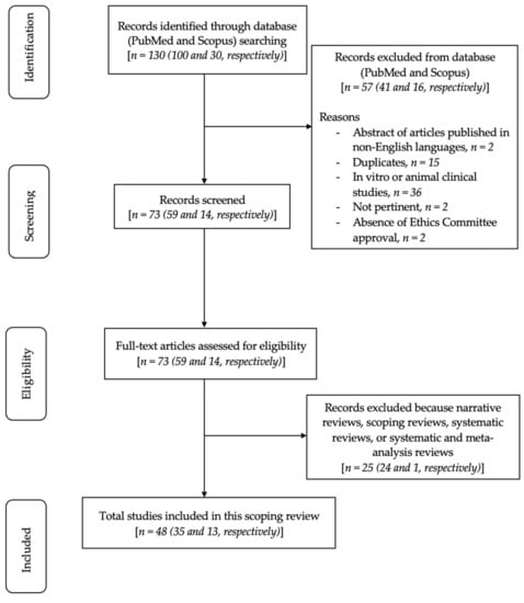 In total, 130 articles were primarily identified using MeSH terms. Subsequently, 41 articles from PubMed and 16 articles from Scopus were removed because the abstracts were published in non-English, and/or duplicate, and/or in vitro or animal clinical studies, and/or irrelevant, and/or lacked ethics committee approval. Consequently, 73 articles were screened and assessed for eligibility. Finally, 25 articles were further excluded as narrative reviews, scoping reviews, systematic reviews, or systematic and meta-analysis reviews. In total, 48 relevant articles were included and assessed in this review. The flowchart of the review process is shown in Figure 1.