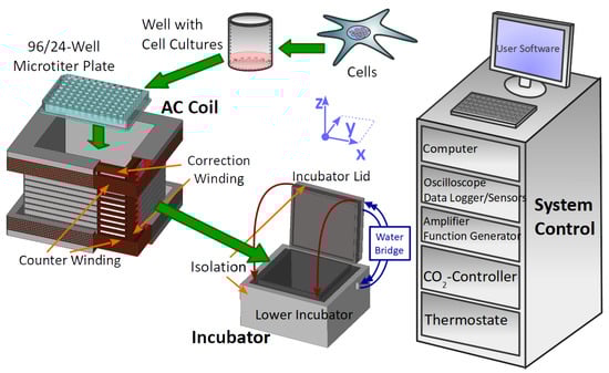 - Schuderer, J.; Oesch, W.; Felber, N.; Spät, D.; Kuster, N. In vitro exposure apparatus for ELF magnetic fields. Bioelectromagnetics 2004, 25, 582–591. [Google Scholar] [CrossRef]