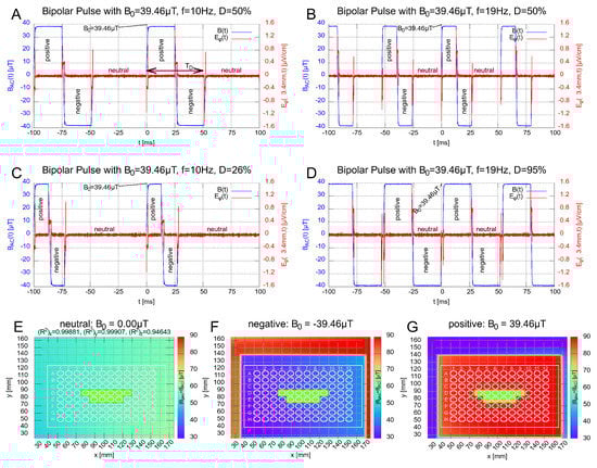 Subfigures (A–D): Show the signal shape of the magnetic field (blue) for the bipolar rectangular pulses with 10 Hz and 19 Hz, respectively. The altered magnetic-field duration (defined in subfigure (A)) was chosen to be ms and ms. Each bipolar signal has three states, labeled with positive, negative and neutral. The duty cycles of the signal in (C,D) were chosen to reflect a equivalent to the signal in (A,B), respectively. The red curve represents the -component of the induced electric field , which was calculated by the induction law (Supplement, Section S3.3) and stays below ≤ for all fields at well boundary at mm (∅6.8 mm). Subfigures (E–G): Show the field distributions of the total magnetic field (Supplement, Section S3.2 for definition) for the three states. The wells used for the samples are labeled in green.