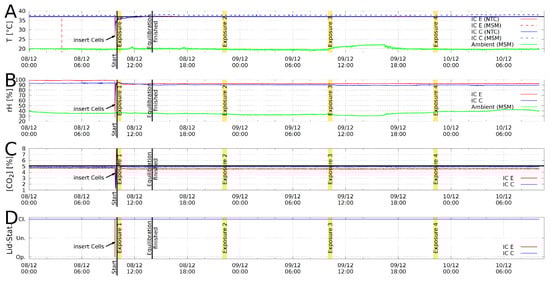Fluctuations in temperature, relative humidity and concentration for incubator E and C can be calculated from the log files (Figure 4), which are characterized by the mean, standard deviation, minimum and maximum values (Supplement, Table S2). In order to estimate the system’s accuracy, the time after reaching equilibrium condition until the termination of the experiment was used to extract the above-mentioned values. The minimum and maximum values for the temperature differ only by K for incubator E and K for incubator C. This also includes the ohmic heating during the exposure and ambient/room temperature fluctuations. The passive controlled humidity remains in the range for incubator E and for incubator C, respectively. Similar for concentration, [CO for incubator E and for incubator C, which is very close to the -accuracy of the -controller (). This accuracy is entirely consistent with commercial incubators as used, for instance, in [].