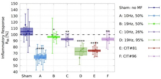 Effect of magnetic-field exposure on inflammatory response in HEK-Blue™ hTLR4 cell cultures. Each data point is represented by the ratio in the inflammatory responses (Supplement, Equation S8a). Box plots represent the mean over the biological repeats ± standard deviation. Sham experiment: experiments were conducted without magnetic-field exposure in both of the incubators and served as a measurement of the background variation between identical experiments. MF-exposure conditions are described in Section 2.2 and the data is shown in the Supplement, Tables S3 and S4. N: number of biological repeats (Sham , A , B , C , D , E , F ); ****, **; * represent p-value significance in comparison to sham exposure; the correlation coefficient of Cohan’s d test is also shown in the Supplement, Table S4 quantifying a strong effect size ().