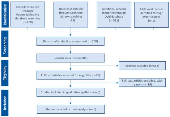 Figure 1 shows the flow diagram of study selection. A total of 708 studies were screened. Of these, 683 publications were excluded after the application of the inclusion and exclusion criteria. The remaining 25 articles were considered potentially relevant and were evaluated by reading the full texts. Of these, six studies were considered for qualitative and quantitative analysis [,,,,,], while 19 articles were excluded (Supplementary Table S1).