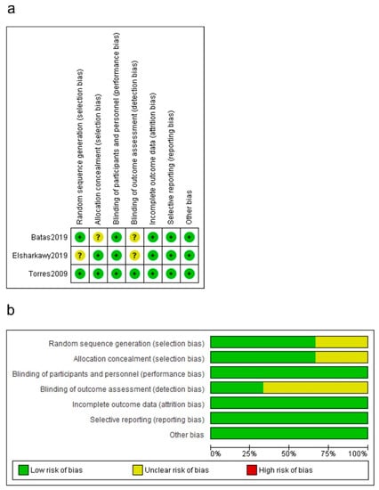 Quality assessment of the included RCTs. (a) Risk of bias summary, review of authors’ judgments about each risk-of-bias item for each included study. (+): low risk of bias. (?): unclear risk of bias. (b) Risk-of-bias graph, review of authors’ judgments about each risk-of-bias item, presented as percentages across all included studies [,,].