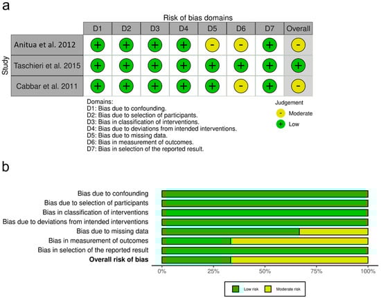 Quality assessment of the included prospective non-randomized studies. (a) Risk-of-bias summary, review of authors’ judgments about each risk-of-bias item for each included study. (+): moderate risk of bias. (b) Risk of bias graph, review of authors’ judgments about each risk-of-bias item, presented as percentages across all included studies [,,].