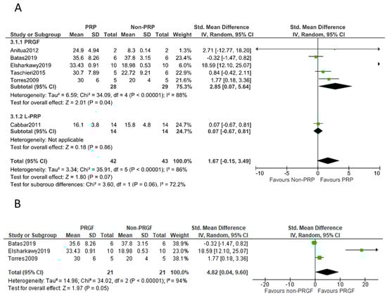 Six controlled trials evaluated the addition of PRPs to bovine bone-grafting material in sinus-lifting procedures. A total of 85 sinuses were included (42 and 43 for PRP and non-PRP groups, respectively). All the biopsies were harvested five to six months after surgery and stained with basic fuchsine and methylene blue [], van Gieson’s picro-fuchsin [], Masson trichrome special stain [], Alcian blue, or hematoxylin [,]. Considering the pooled data, the meta-analysis found no significant differences in the primary outcomes of newly formed bone when comparing the PRP group to the control group (SMD: 1.67; 95% CI: −0.15 to 3.49). When a subgroup analysis was performed, a significant effect of P-PRP was observed (SMD: 2.85; 95% CI: 0.07 to 5.64). In all these studies, PRGF was applied. L-PRP showed no significant effect (SMD: 0.07; 95% CI: −0.67 to 0.81) (Figure 4A).