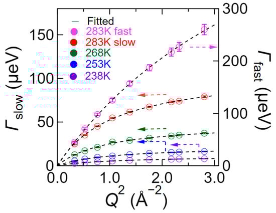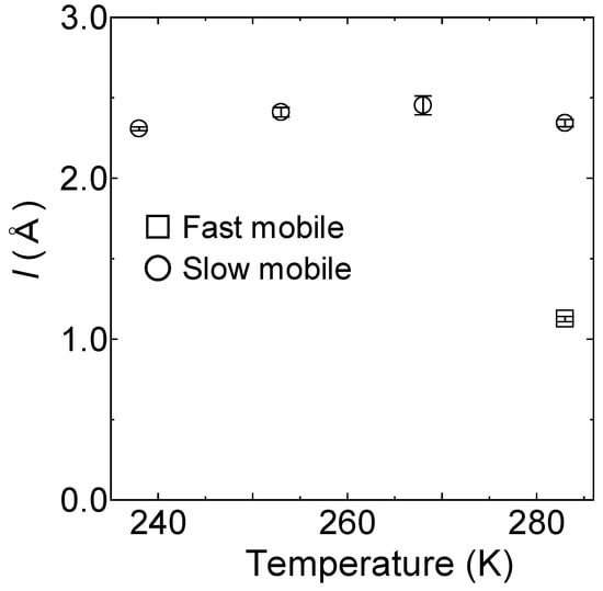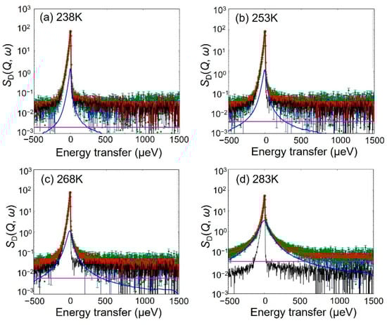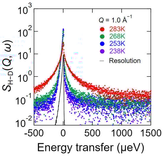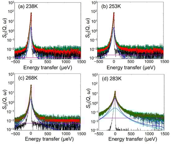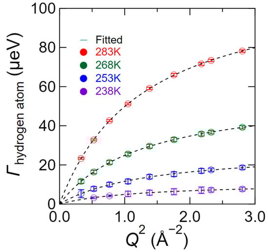 3.2. QENS Spectra of the Hydration Water Dynamics in the Hydrated Chitosan