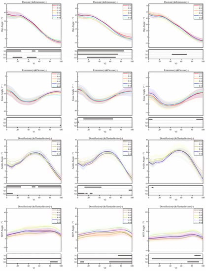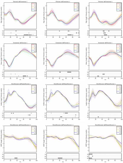 3.1. The Influence of Running Velocity and LBS on Lower Limb Joints’ Kinematic Variables