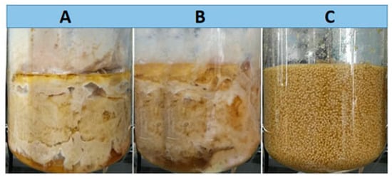 Mycelium morphologies under 50% (A), 20% (B), and 10% (C) of initial nitrogen source concentration in 5 L bioreactor.