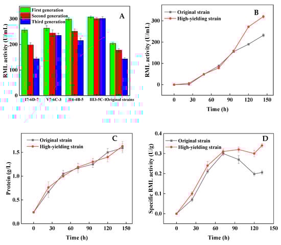 Comparison of the RML activity by different strains (A) in shake flasks, and the comparison of RML activity (B), protein concentration (C), and specific RML activity (D) between the high-yield strain and original strain in 5 L bioreactor. Data expressed as the mean ± standard deviation (n = 3 per group, per time point).