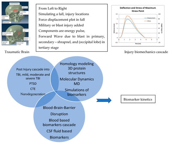 Injury from fall/blast with force, displacement and occipital injury, cascading into TBI, PTSD and CTE, investigated within protein homology, MD, blood–brain barrier and kinetics [].
