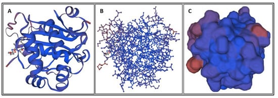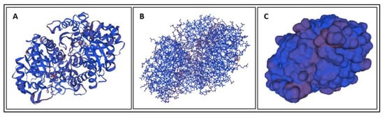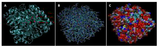 (A) A cartoon model, (B) a ball-and-stick model, and (C) a surface model of NSE made using amino acid sequences from the UniProt database [].