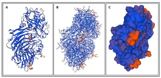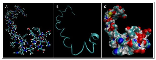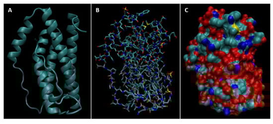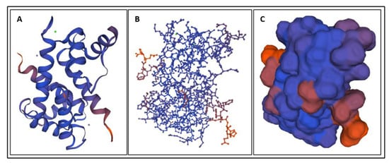 (A) A cartoon model, (B) a ball-and-stick model, and (C) a surface model of IL-6 made using amino acid sequences from the UniProt database [].