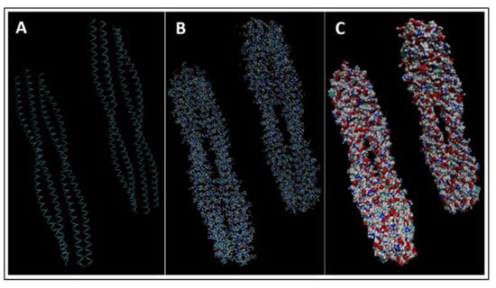 (A) A cartoon model, (B) a ball-and-stick model, and (C) a surface model of NF-L [].