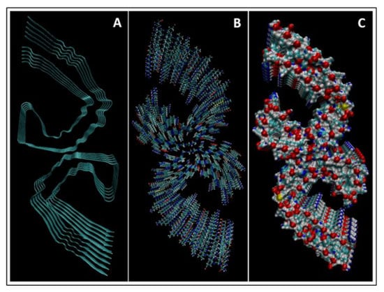 (A) A cartoon model, (B) a ball-and-stick model, and (C) a surface model of GFAP [].