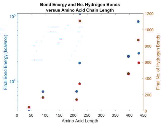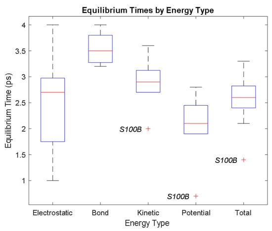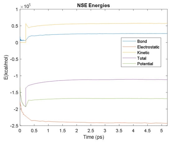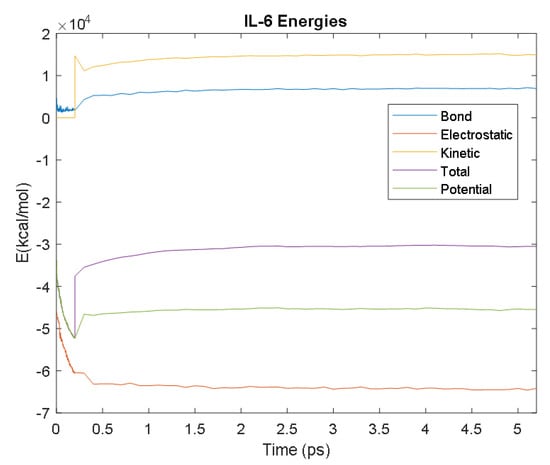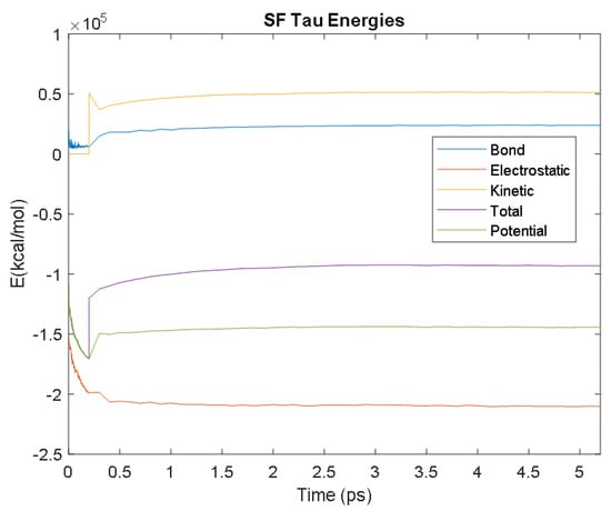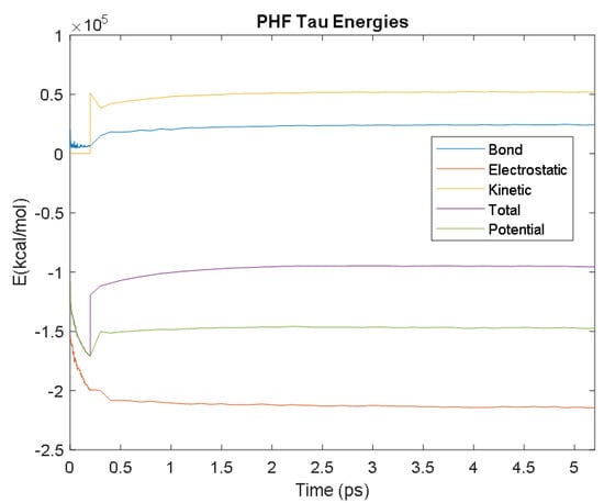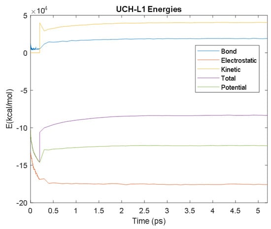 The PDB entry selected to represent each biomarker was as follows: 6szf for Aβ42, 1alu for IL-6, 1gnh for CRP, 3d0y for S100B, 3ucc for NSE, 6a9p for GFAP, 2etl for UCH-L1, 7mkg for SF tau, and 7mkh for PHF tau. Each protein was simulated in a water box at 310° K for 5 ps. The data from these simulations were used to plot the bond, electrostatic, potential, kinetic, and total energies for each protein over the course of the simulation.