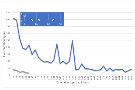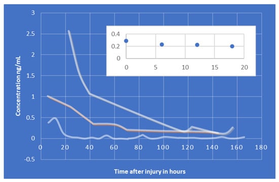 - Welch, R.D.; Ellis, M.; Lewis, L.M.; Ayaz, S.I.; Mika, V.H.; Millis, S.; Papa, L. Modeling the Kinetics of Serum Glial Fibrillary Acidic Protein, Ubiquitin Carboxyl-Terminal Hydrolase-L1, and S100B Concentrations in Patients with Traumatic Brain Injury. J. Neurotrauma 2017, 34, 1957–1971. [Google Scholar] [CrossRef]