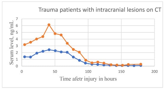 S100B is a calcium-binding protein largely expressed in astrocytes and is involved in the regulation of brain cells’ energy metabolism []. S100B blood concentration was not indicative of TBI and abnormal CT findings after injury and was largely affected by other types of tissue damage besides the TBI.