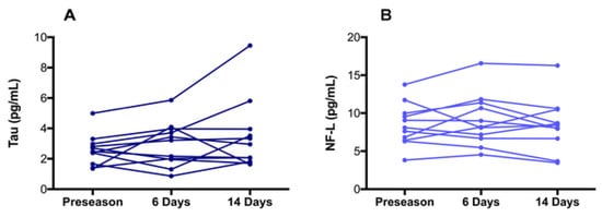 - Wallace, C.; Zetterberg, H.; Blennow, K.; van Donkelaar, P. No change in plasma tau and serum neurofilament light concentrations in adolescent athletes following sport-related concussion. PLoS ONE 2015, 13, e0206466. [Google Scholar] [CrossRef]