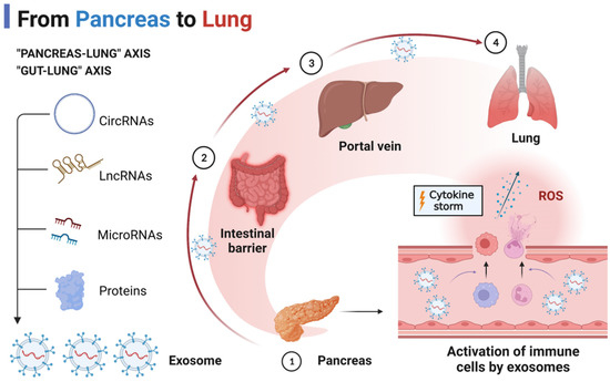 Thus, we hypothesize that the pancreas and gut release exosomes containing pro-inflammatory mediators during AP, with the pancreas–lung axis and the gut–lung axis serving as the primary delivery pathways (Figure 1).