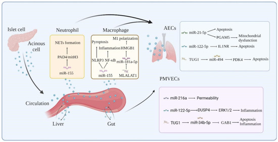 MiR-155 appears to be consistently highly expressed in the pancreas, gut, lung, and peripheral blood of AP models. Inhibition of miR-155 alleviates intestinal barrier damage [73], immune imbalance [70], and impaired autophagy [74,75] induced by AP. For exosome-specific miR-155, researchers discovered that plasma-derived exosomes were enriched with inflammatory miR-155, whereas ascites-derived exosomes were not [76]. Exosome-specific miR-155 that the liver has activated may reach the alveoli and contribute to the development of ALI. Specifically, exosome-specific miR-155 activates alveolar macrophages and triggers NOD-like receptor protein 3 (NLRP3)-dependent pyroptosis [77]. The inhibition of MiR-155 alleviates ALI by inhibiting macrophage proliferation [78], antagonizing nuclear factor kappa beta (NF-κB) signaling [79], and modulating neutrophil extracellular trap formation [80] in the lungs.