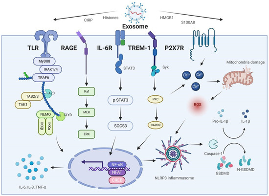 A clinical study including 246 patients found that plasma S100A8/S100A9 levels were more significant in patients with mild and severe AP compared to healthy volunteers [131]. At the time, researchers discovered no statistically significant difference in plasma S100A8/S100A9 levels between individuals with severe AP and those with mild AP. Interestingly, when exosomes were introduced into biological research, it was discovered that the difference in exosome-specific S100A8/A9 levels from severe AP vs. mild AP was substantial. The study by Waldron et al. was the first to give us some hints [132]. They collected plasma from 12 patients with alcoholic AP and 12 healthy controls for proteomic analysis. They identified 37 differentially expressed proteins, 31 of which were upregulated and 6 of which were downregulated. Interestingly, almost all of the upregulated proteins were associated with cellular compartments, including exosomes and extracellular spaces. Among them, S100A8, a DAMP, previously described, which is closely associated with the development of SAP, was also shown to be significantly up-regulated in the plasma of AP patients [132]. The potential of exosome-specific S100A8 in predicting the severity of SAP was also confirmed in a recent study. Exosome-specific S100A8 and S100A9 isolated from the plasma of SAP patients promoted the activation of the NF-κB signaling pathway and the level of inflammatory mediators in macrophages. Furthermore, the promotion of SIRS by S100A8 and S100A9 depends on the activation mechanism of nicotinamide adenine dinucleotide phosphate (NAPDH) oxidase. In summary, these findings suggest that exosome-specific S100A8 and S100A9 are associated with the intensity of SIRS during AP [133].
