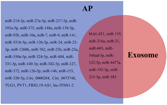 Peripheral blood-derived exosomal miR-155, miR-216a, miR-21, (miR-603, miR-548ad-5p, miR-122-5p, miR-4477a, miR-192-5p, miR-215-5p, and miR-583), lncRNA PVT1, and MALAT1 [162] were linked with the severity of SAP and may provide new insight into the etiology of SAP and act as biomarkers of SAP. In addition, some AP serum/mesenteric lymph/plasma markers such as FBXL19-AS1 [55] and lnc-ITSN1-2 [56], miR-214-3p [194], miR-27a-5p [195], miR-217-5p [196], miR-193a-5p [197], miR-375 [198], miR-148a [199], miR-138-5p [200], miR-92b [201], miR-10a [201], miR-7 [202], miR-9 [202], miR-141 [203], miR-551b-5p [204], miR-126-5p [205], miR-24 [206], (miR-22-3p, miR-1260b, miR-762, miR-23b, miR-23a, miR-550a-5p, miR-324-5p, miR-484, miR-331-3p, miR-140-3p, and miR-342-3p [207]), miR-127 [208], miR-372 [209], miR-126-5p [210], miR-146 [211], miR-153 [212], miR-320-5p [197], Circ_0000284 [213], and Circ_0073748 [214], also exist in the exosome (Figure 4). These potential exosomal biomarkers also provide an important direction for the diagnosis and prognosis of AP in clinical applications.
