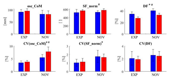 Shapiro–Wilk tests were conducted to confirm the normality of data distribution. The dependent variables were osc_CoM, SF_norm, and DF, as well as their variabilities (operationalized by CV). For each of these dependent variables, a 2 × 2 repeated-measures ANOVA (rmANOVA) was calculated with the factors expertise level (EXP and NOV) and speed (10 and 15 km/h). In total, six rmANOVAs were performed. The Bonferroni–Holm method was used to correct the results for multiple comparisons [42]. The significance level was set a priori to p < 0.05. Partial eta-squared (small effect: < 0.06; medium effect 0.06 ≤ < 0.14; large effect: ≥ 0.14) was calculated as a measure of the effect size for rmANOVA.