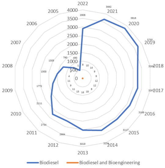 Number of documents published with keywords ‘biodiesel’ and ‘biodiesel and bioengineering’.