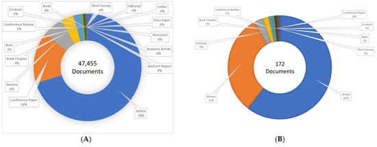 Different types of documents published with keywords (A) ‘biodiesel’ and (B) ‘biodiesel and bioengineering’.