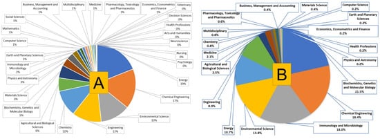 Documents published in different discipline with keywords (A) ‘biodiesel’ and (B) ‘biodiesel and bioengineering’.