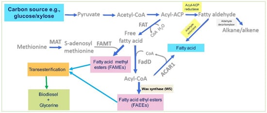The production cost of biofuels can be significantly reduced using less biomass expensive materials. However, bacteria or yeasts can convert biomass-derived sugars to lipids/fatty acids that transform into biodiesel via transesterification []. Advances in synthetic and metabolic pathway bioengineering have expanded the substrate ranges. E. coli was the first microbe studied to produce fatty acid ethyl esters (FAEEs) or methyl esters (FAMEs) directly, which can be used to produce biodiesel. An overview of the synthesis of lipid pathways to produce biodiesel in E. coli is shown in Figure 8. The expressions: fatty acyl thioesterases (FATs) lead to the synthesis of free fatty acids (FFAs) converted to fatty acid (FAMEs) by FAMT using AdoMet as FAEEs by acyl-CoA synthase (FadD) and wax synthase (WS). Acyl-ACP is converted to fatty aldehyde by acyl-ACP reductase (ACR) and then to alkanes/alkenes by ADC or fatty alcohols by fatty aldehyde reductase (ALR). Acyl-CoA reductase (ACAR1) can facilitate acyl-CoA conversion to fatty alcohols.