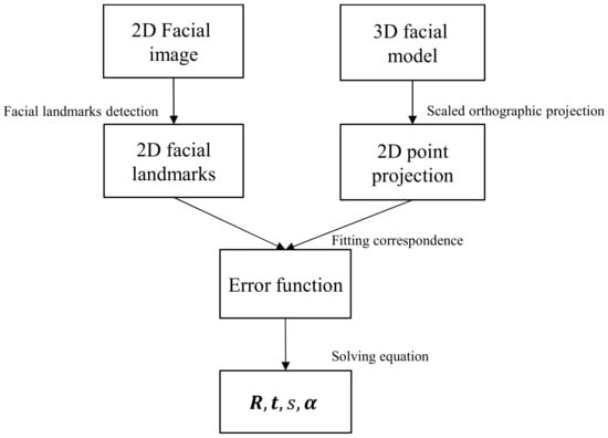 The information processing pipeline of the 3D morphable modeling approach [] to reconstruct the 3D face shape from a single image is illustrated as in Figure 2. Firstly, a set of 2D facial landmarks are detected from the input image by existing face detectors [,]. Secondly, the scaled orthographic projection projects another set of landmarks from the 3D model to obtain 2D points in the image plane corresponding with those points obtained from the 2D image. This step results in an equation that parameterizes the pose and shape parameter. During the next step, a cost function is built to minimize the error between the 2D facial landmarks from the 3D model and 2D facial landmarks from the 2D facial image.