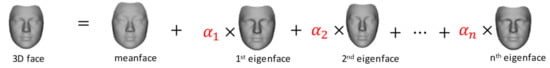 In the PCA decomposition, the mean shape and the shape bases are shared for every specific individual, as presented in Figure 3. This means that the mean shape and the shape bases () are the same for every subject in the training set; those can be assumed as the population and can be used for other subjects that are different from the subject in the training set. Therefore, from a given facial image, the 3D face can be reconstructed by finding the coefficients of the specific shape.