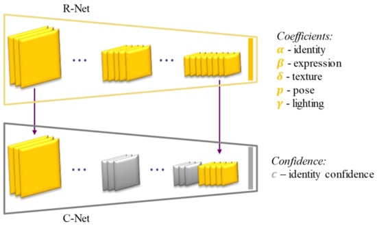 The network architecture for learning the parameters of the face model. The output of models, including coefficients that represent identity (), expression (), texture (), pose (), lighting (), and identity confidence ().