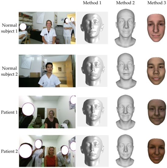 The input images of the frontal face of the two facial palsy patients and two healthy subjects are used to reconstruct the corresponding patient-specific face. The reconstructed 3D face shapes are shown in Figure 6 with three applied methods. Comparing the three methods, the second method can reconstruct wrinkles with a full head instead of the cropped face, compared with methods one and three. The second and third methods were able to reconstruct the shape detail parameters, such as shape, pose, and expression, while the first method only reconstruct the subject in the neutral position.
