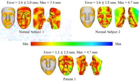 The performance was then quantified by comparing it with the 3D face obtained from the 3D camera Kinect and the MRI image. The 3D face from the MRI-based method can be treated as the ground-truth data of the person, while the 3D face from the Kinect-based method reconstructs the face with an error of about 1mm. Figure 7 demonstrates the smallest error of the 3D face reconstructed from the input image and the 3D face from the MRI-based method for the first method (fitting a 3DMM). Only three subjects (two normal subjects and one patient) were estimated because the MRI data of the second patient is not available. The average error of the three subjects is from 2.020 mm to 6.310 mm. The smallest error is observed in the center of the face area, while the performance suffers heavily at the jaw. This is because the input image is in the frontal area of the face, while the jaw part is occluded from the frontal face image.