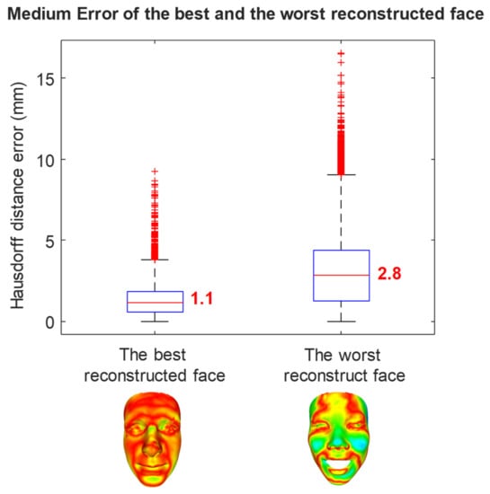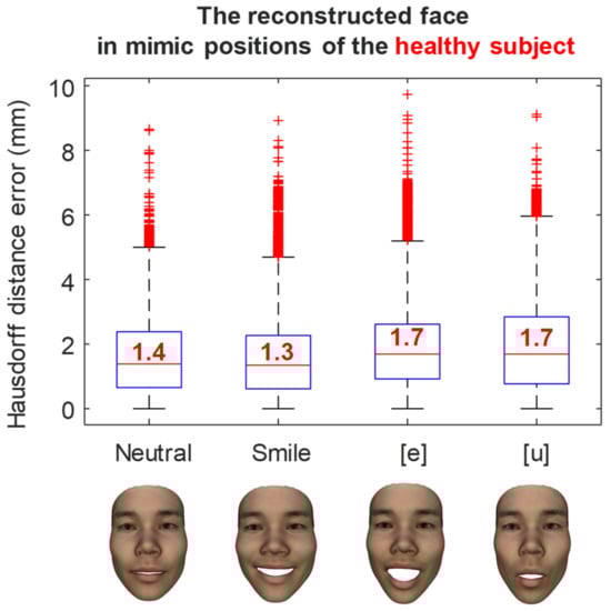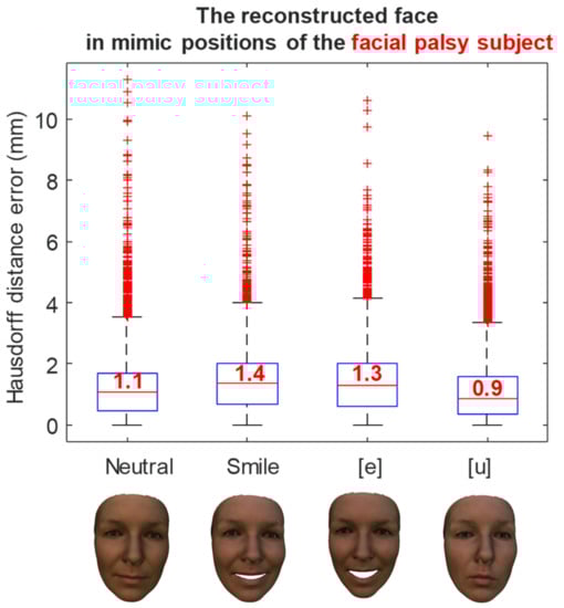 The reconstruction errors of a healthy subject in various mimic positions are shown in Figure 11. In the neutral position, the medium reconstruction error is 1.4 mm, while this error is 1.3 mm and 1.7 mm in smile, and [e] and [u] pronunciations, respectively. Similarly, the reconstruction errors of a facial palsy patient in various mimic positions were shown in Figure 12. The medium reconstruction error is 1.1 mm, 1.4 mm, 1.3 mm, and 0.9 mm in neutral, smile, and [e] and [u] pronunciations, respectively.