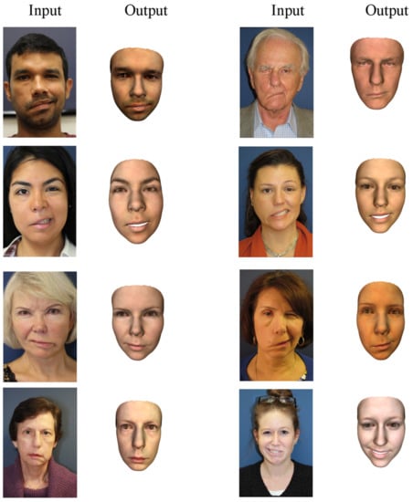 The first approach uses a prior statistical 3D facial model to fit the input images [,,]. In fact, 3D face reconstruction from 2D images is an ill-pose problem. It needs some types of previous knowledge. In order to find the solution, statistical 3D face models are preferred methods for incorporating this previous knowledge since they encode facial geometric variations. The 3D morphable model is a statistical 3D face model built from a set of 3D scans of heads. This model includes both the shape and the texture of the face. There are several existing 3D statistical models from the last few decades. For example, Blanz and Vetter (1999) created a 3DMM in UV space from 200 young adults, including 100 females and 100 males []. The well-established Basel Face Model (BFM) [] was built from 200 subjects (100 males and 100 females with an average age of 24.97 years old, from 8 to 62) with most of the subjects being Caucasian. Several examples are the FaceWarehouse model [], FLAME model [], and BFM 2017 model []. In particular, the FaceWarehouse model was built by Cao et al. [] (2014) from depth images of 150 participants. Each has 20 different expressions, and the age range is between 7 and 80 years old. Afterward, by identifying parameters of the linear combination of 3D statistical model bases that best matches the provided 2D image, a new 3D face can be reconstructed from one or more images. For example, Wood, Erroll, et al. [] fit a morphable model to dense landmarks covering the entire head, including the eyes and teeth to a wild image to reconstruct monocular 3D face. This method is effective for predicting dense landmarks for a real-time system at over 150FPS.