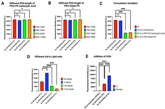 Liposome formulation optimization based on in vitro transduction on CAR deficient CT26 mouse colon cancer cell line at MOI 50 (n = 3): (A) Liposomes manufactured with different length of PEG-PE carboxylic acid (p value: ns = not significant). (B) Liposomes manufactured with different length of PEG-folate-PE (p value: ns = not significant). (C) Liposomes manufactured by removing one excipient at a time demonstrating significance of PEG-PE carboxylic acid and PEG-folate-PE (p value: ns = not significant, *** ≤ 0.001). (D) Liposomes manufactured by different Ad to DOTAP lipid ratios (p value: *** ≤ 0.001). (E) Liposomes manufactured by addition of HSA resulting in 100-fold higher transduction compared to the unencapsulated Ad (p value: *** ≤ 0.001, **** ≤ 0.0001).