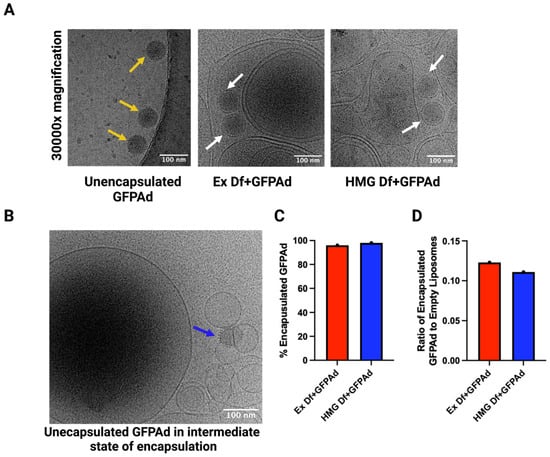 Cryo-EM images of Ad liposomes and unencapsulated Ad: (A) Cryo-EM images of unencapsulated GFPAd, Ex Df + GFPAd, and HMG Df + GFPAd at 30000× magnification. Yellow arrows highlight unencapsulated GFPAd without lipid encapsulation and white arrows highlight spherical lipid encapsulation around GFPAd in GFPAd liposomes. (B) Cryo-EM image demonstrating intermediate state of virus encapsulation. Blue arrow highlights the unencapsulated GFPAd in intermediate state of encapsulation. All scale bars represent 100 nm. (C) % Encapsulation efficiency of GFPAd in Ex Df + GFPAd (red bar = 96%) and HMG Df + GFPAd (blue bar = 98%). (D) Ratio of encapsulated GFPAd to empty liposomes in Ex Df + GFPAd (red bar = 0.12) and HMG Df + GFPAd (blue bar = 0.11).